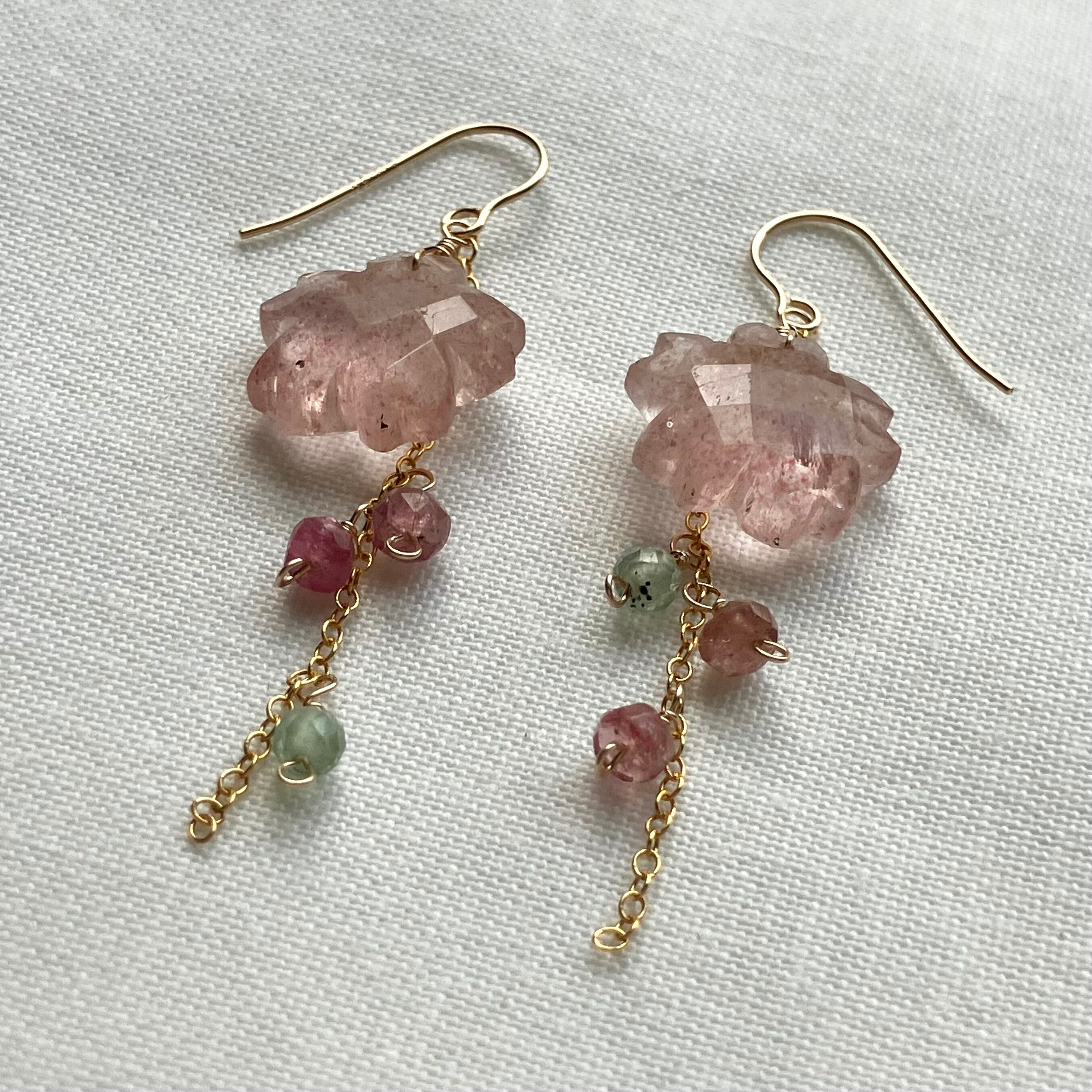 優雅で存在感のあるデザインは、春の特別な日に身につけたいアイテムです。小粒はピンクトルマリンとグリーンカイヤナイトを使用しています。