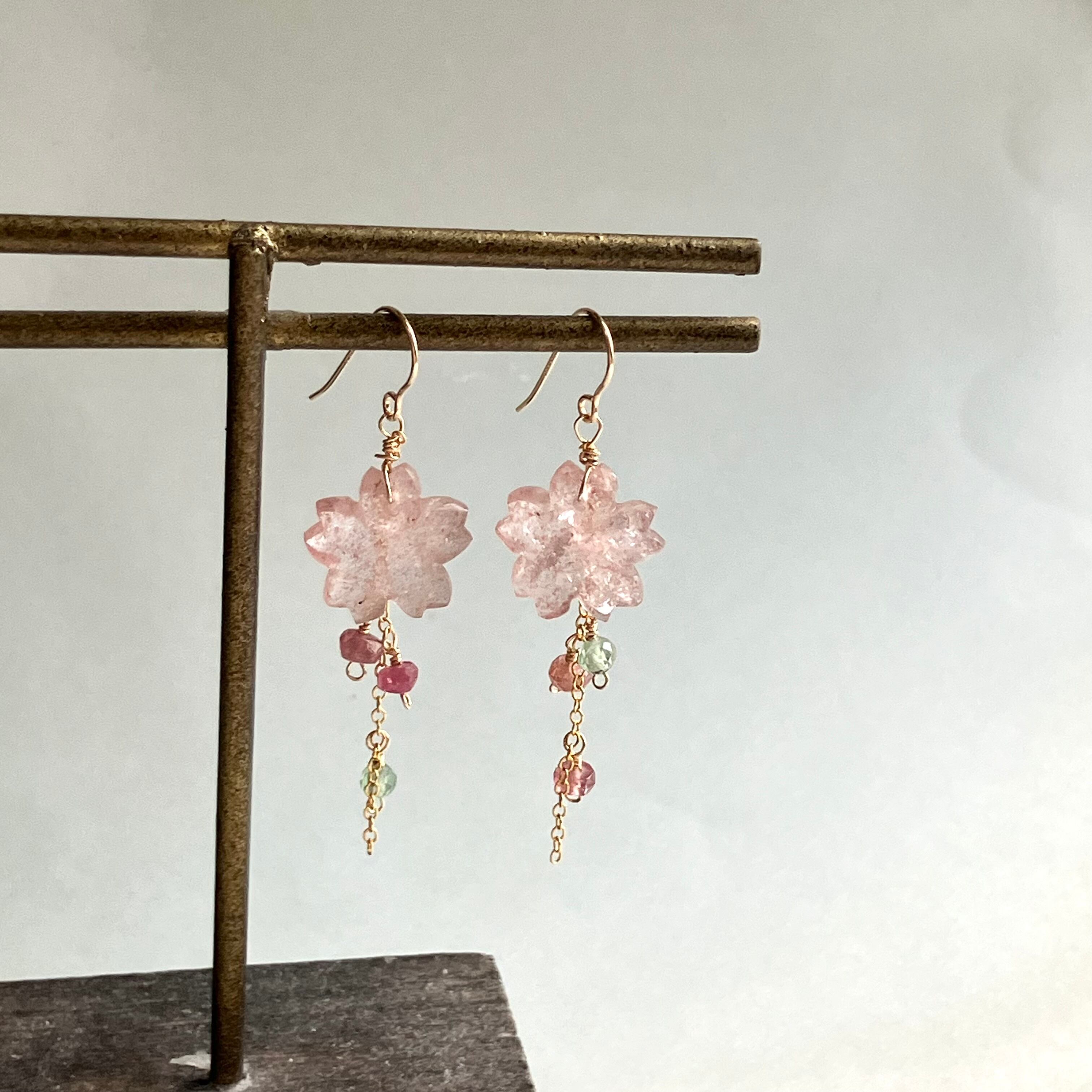 14kgf さくらピアスは、桜シェイプのピンクエピドートを使用した、春の訪れを感じさせる華やかなデザインのアクセサリーです。耳元で揺れるこのピアスは、淡いピンクの色合いが温かい雰囲気を醸し出し、春のコーディネートを美しく引き立てます。