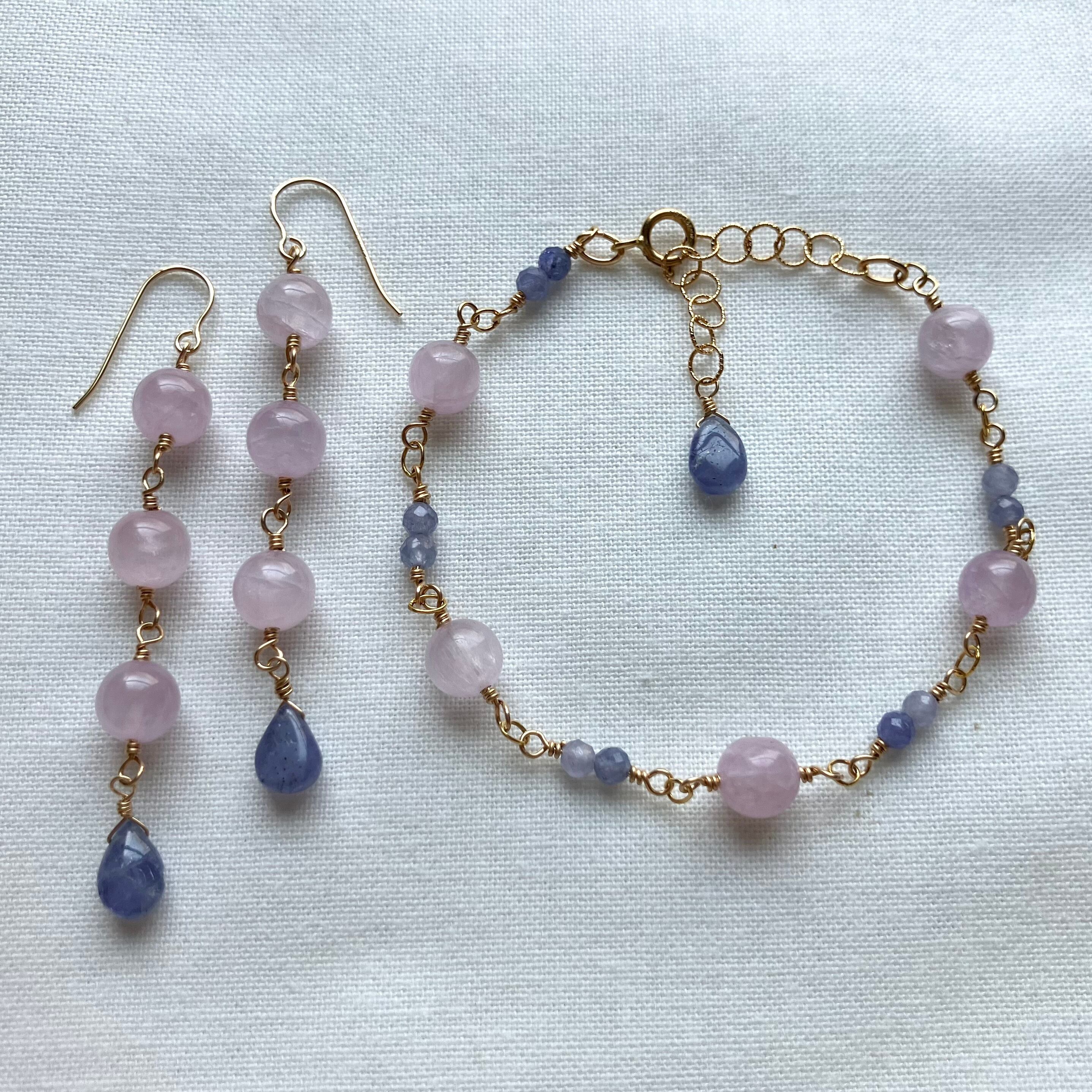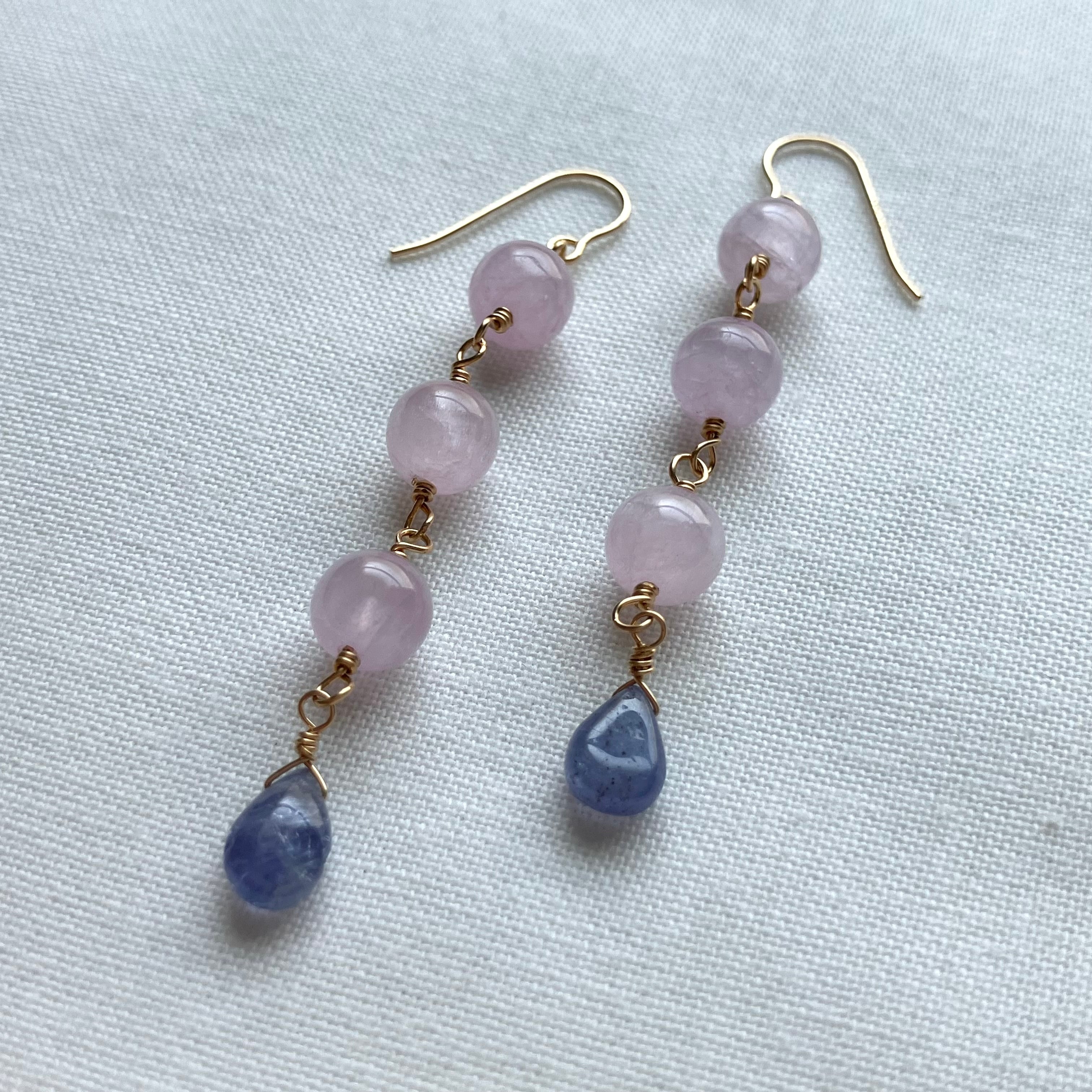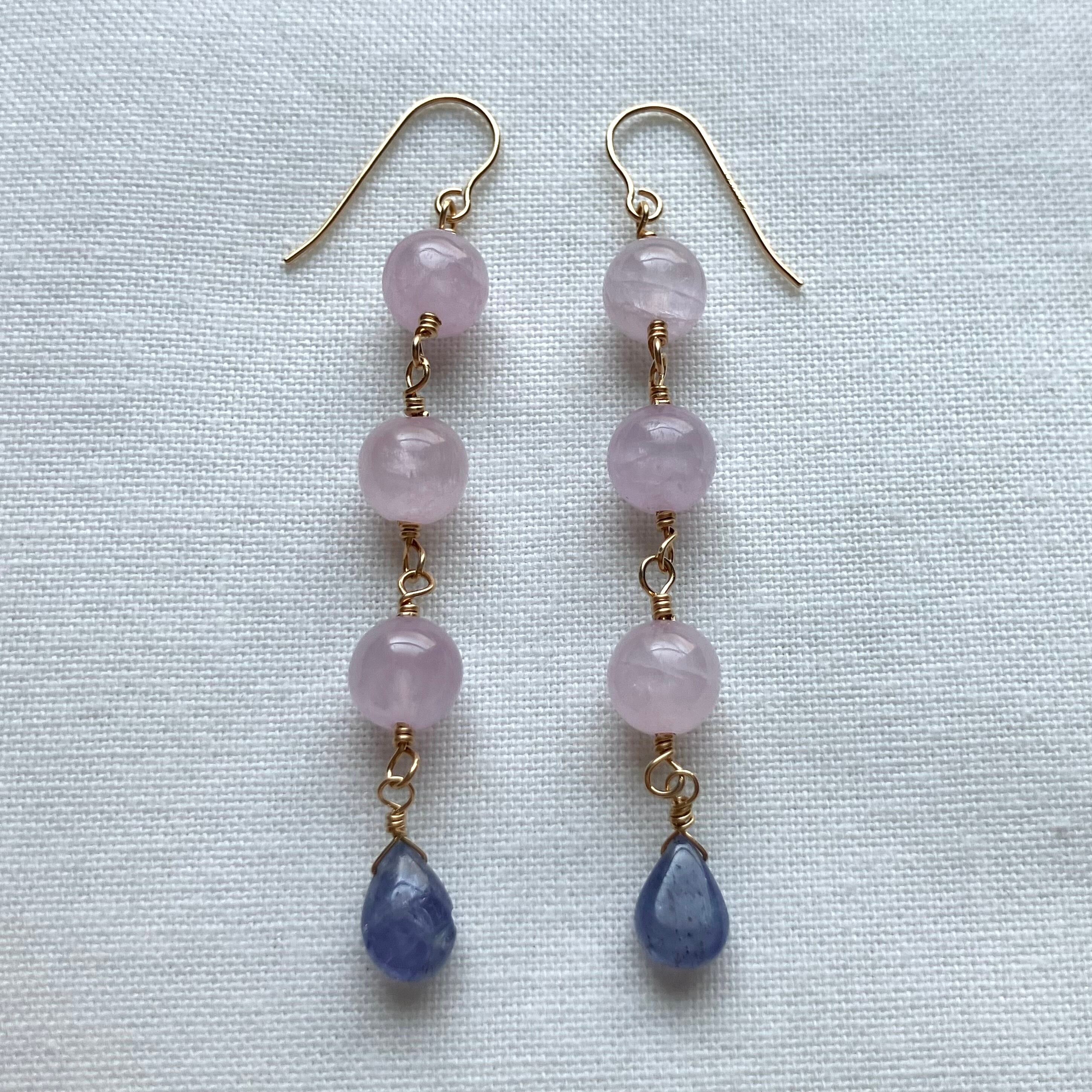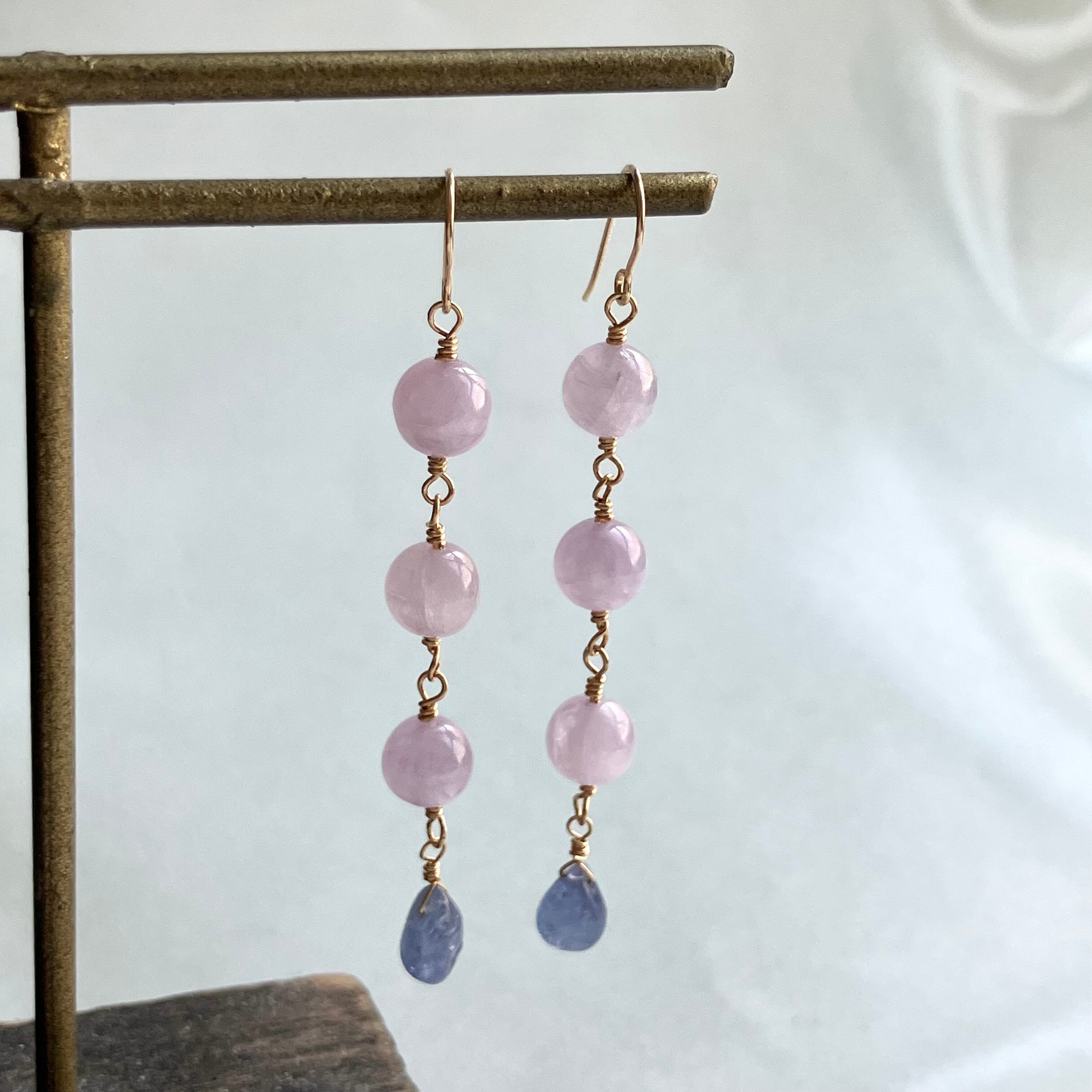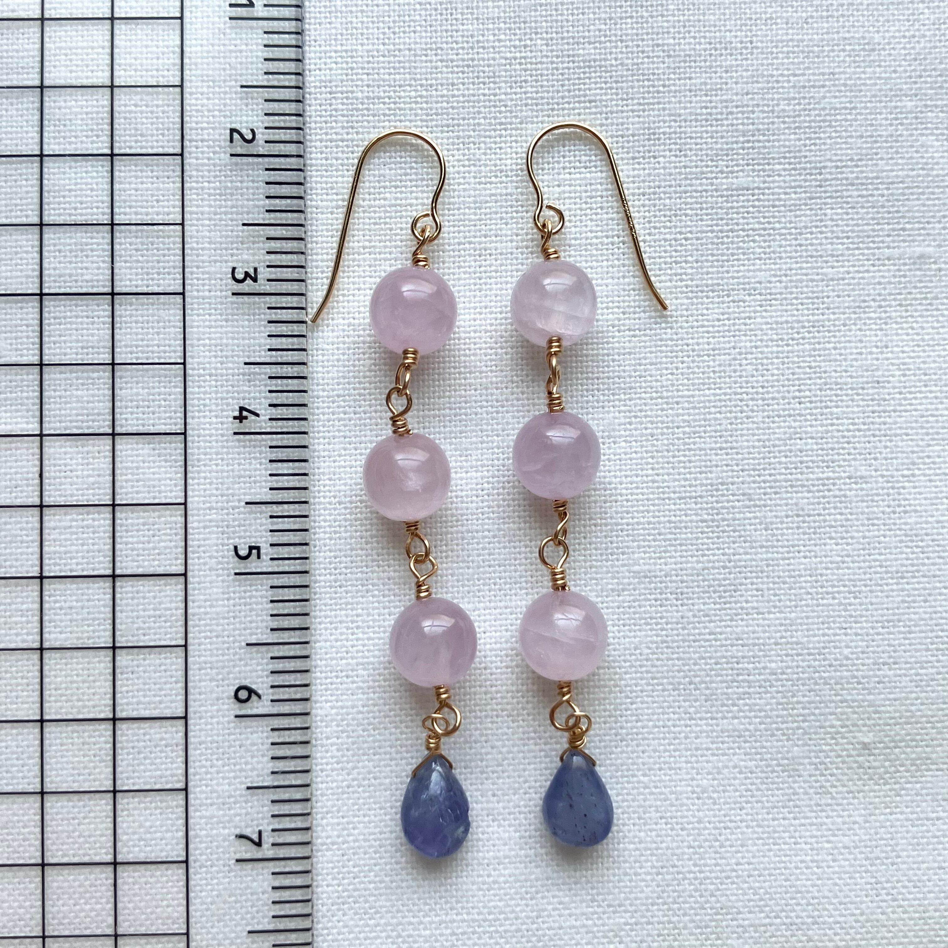 紫陽花カラーのピアスは、季節の移ろいを感じさせる美しい色合いが魅力のアクセサリーです。クンツァイトの優しいピンクと、タンザナイトの神秘的な青の美しい色合わせのピアスが、耳元で揺れる度に華やかな印象を与えます。